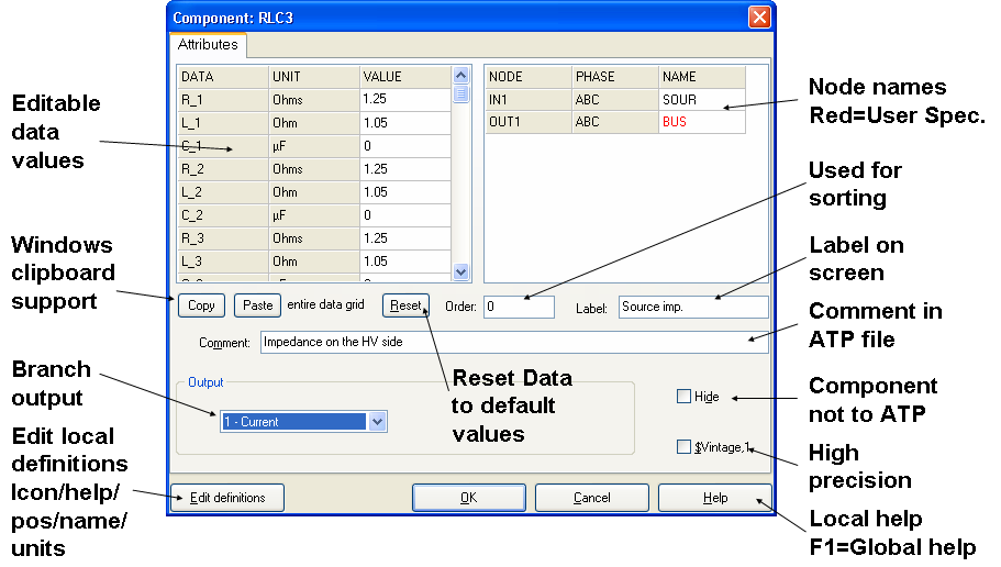 On the Attributes page of the Open Component dialog box you specify component data parameters in the top-left table (see exceptions below). Many data parameters have a legal range specified. To see what legal range a parameter value has, place the input caret in a data field and press the Ctrl+F1 keys. If you specify an illegal value, an error message is issued when you move the caret to another data field, change active page or select the OK button. The user is also free to assign a 6 character text string or variable to most data for standard components (permission given in the support file). Values are assign to these variables under ATP|Setting/Variables and this is written to the ATP file with $Parameter. The node names can be specified in the top-right table where names specified by the user is drawn in a red color. Node names are also specified in the Open Node dialog box which opens after a right click on the node or on its name on screen. The visibility of node names is controlled by the Node Names option in the View Options dialog box and the Name on screen option in the Open Node dialog box.