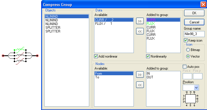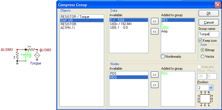 Under Objects all the components in the group are listed with their name (support file) followed by their Label (which is again specified in the Component dialog box). When you click on one of the components it's available data and nodes appears under Available listed by the data's/node's name followed by its value. The component is also drawn in a lime color in the circuit window. The already selected external data/node belonging to this component is also drawn with a lime color in the Added to groups.