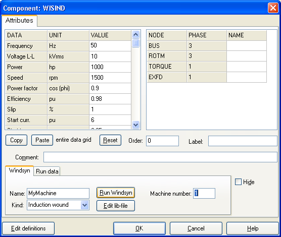 The Windsyn component class in ATPDraw consists of two components; WisInd.sup and WisSyn.sup for induction and synchronous machines respectively. Both components are stored in the standard component library; atpdraw.scl. Default values for the machine parameters are given in these files.